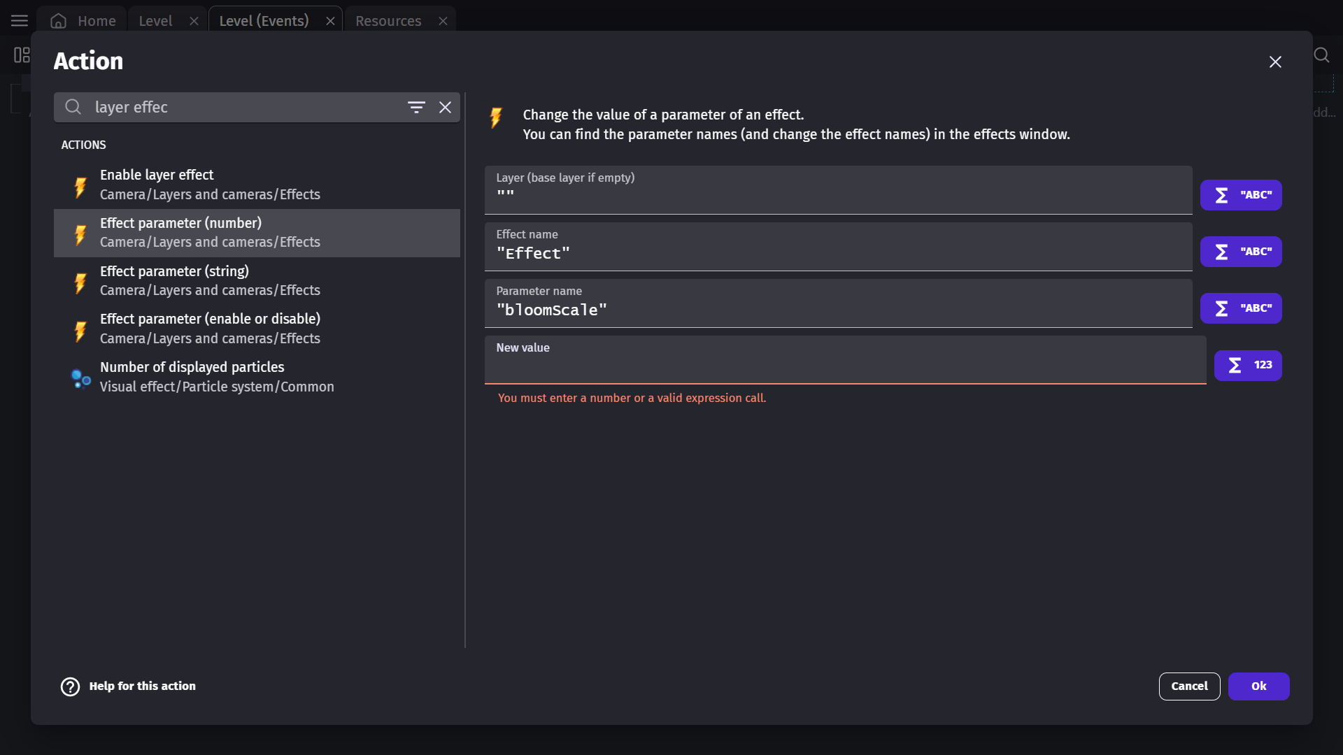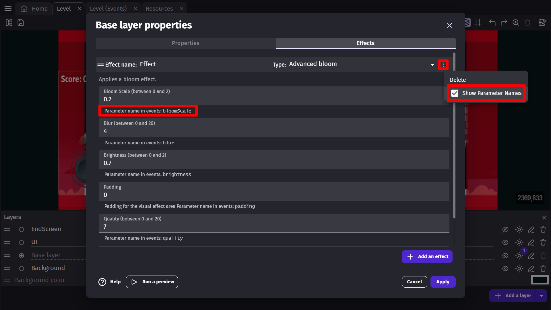 A new layer effect is named "Effect" when created. This name will be useful later for modifying the parameters of the effect during the game.
